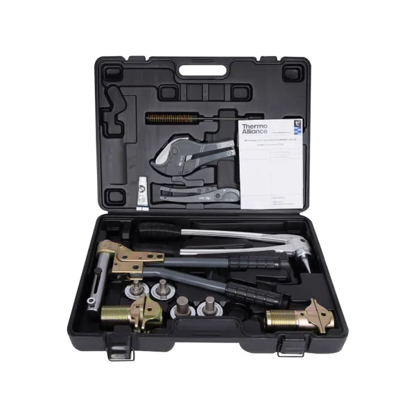 Інструмент для аксіального фітингу Ø 16–32, ручний Thermo?Alliance STD?301 служить для з’єднання аксіальних фітингів із полімерними типу Pex?A, Pex?B, Pex?C, PERT, а також металополімерними трубами при заміні розширювальних насадок під потрібний діаметр. Перевага - надійний храповий механізм, що забезпечує точне й герметичне обтиснення при кожному натисканні. Комплектація: інструмент із набором змінних губок, розширювач із насадками, великий і малий труборізи. Універсальний, сумісний із фітингами ICMA, Rehau, General Fittings, Golan, Heat?Pex, Fado тощо.