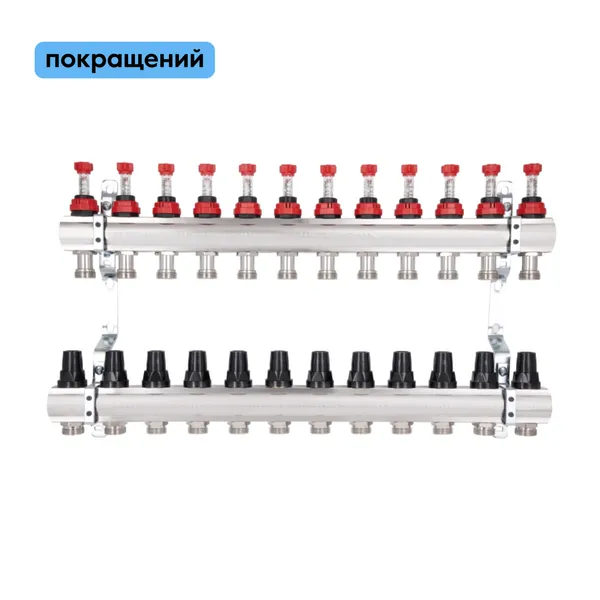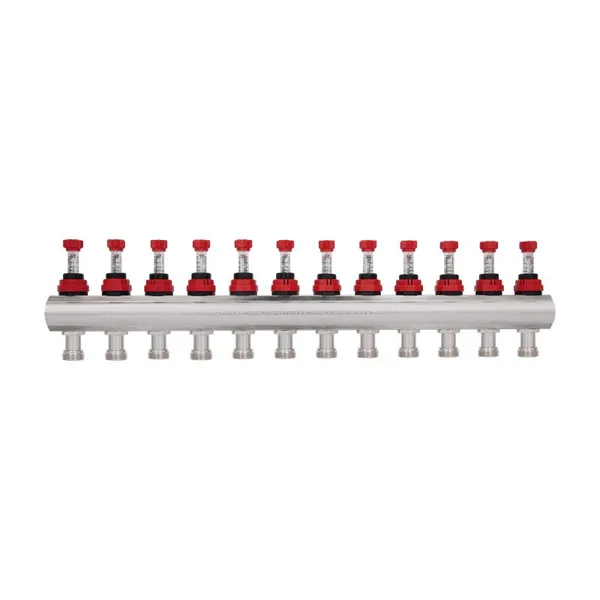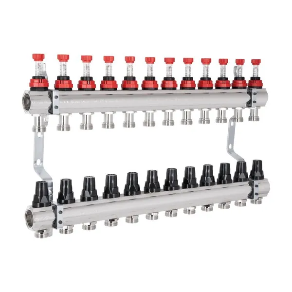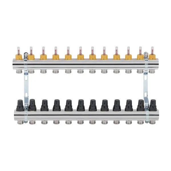 Колектор з витратомірами Thermo Alliance Forte 1" на 12 виходів відповідає за рівномірний розподіл тепла в петлях водяного підлогового опалення. У складі виробу: дві латунні колекторні балки, витратоміри (на вхідній лінії), термоклапани з ручками керування (на зворотному колекторі), кронштейни для кріплення в шафі або на стіні. На термостатичні клапани можна встановити сервоприводи 30х1,5 (не входять у комплект). Правила експлуатації встановлюють максимум температури теплоносія на вході — 95 °C.