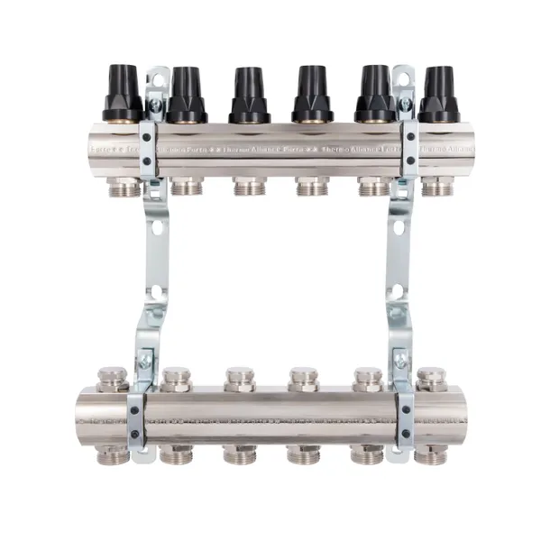 Колектор Thermo Alliance Forte 1" на 6 виходів знадобиться при облаштуванні систем опалення. Гребінка відповідає за розподіл теплоносія в опалювальних контурах. Виріб виконаний з латуні, складається з верхньої і нижньої колекторних балок, для кріплення до стіни або в спеціальній шафі укомплектований двома кронштейнами. Розмір підключення до системи — 1", підключення петель — 3/4 дюйма. Замість ручок регулювання на термоклапани можна встановити сервоприводи 30х1,5.