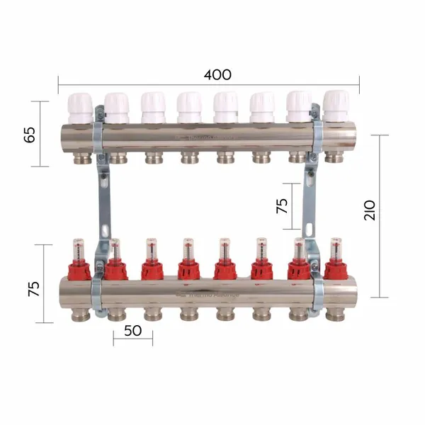 Колектор Standart з нерж. сталі, з термостатичн. клапанами і витратомірами 1" х 8 (вих) SD0048 Thermo Alliance