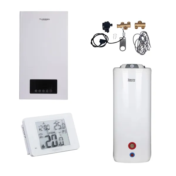 Комплексне рішення Thermo Alliance для котельні TA149DCN647208 є ефективним рішенням для опалення та гарячого водопостачання. Включає електрокотел потужністю 6 кВт, аквакомплект для підключення, комбінований водонагрівач об'ємом 100 літрів та програмований терморегулятор з Wi-Fi керуванням. Ідеальний для будинків та квартир, де потрібна гнучкість в керуванні опаленням та гарячою водою.