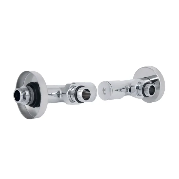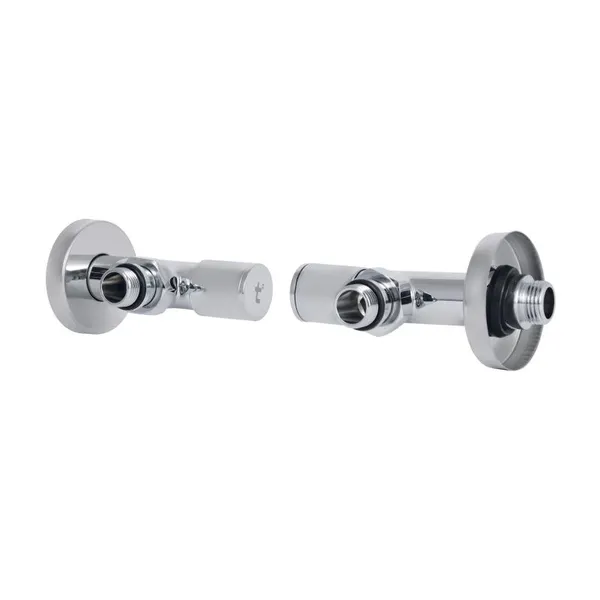 Комплект кранів Thermo Alliance Standart 1/2" НР кутовий SF395W15 призначений для використання при встановленні рушникосушки. Приладні крани виготовлені з високоякісної латуні, покриття — хромоване.