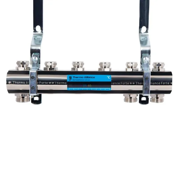 Комплект наліпок із термометром Thermo Alliance Standart призначений для візуального контролю температури на колекторі опалення. У наборі дві самоклеючі термополоси — червона та синя — із температурною шкалою від 20 °C до 60 °C. Наліпки дозволяють швидко визначити температуру подаючого та зворотного контурів, забезпечуючи зручний і наочний моніторинг системи. Завдяки якісному клейовому шару та стійким матеріалам вони надійно фіксуються на поверхні й зберігають точність показань під час експлуатації.