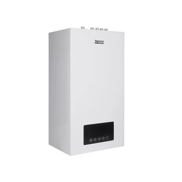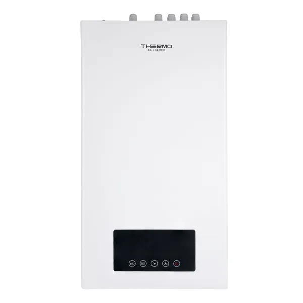 Настінний електричний котел Thermo Alliance 6 кВт призначений для нагріву теплоносія в закритих системах опалення при максимальному надлишковому тиску до 3,0 бар. Основною частиною котла є теплообмінник з нержавіючої сталі та алюмінієвого сплаву, з інтегрованими нагрівальними елементами. Котел обладнаний циркуляційним насосом, розширювальним баком, блоком управління і системою забезпечення безпечної експлуатації. Корпус котла оснащений надійною термоізоляцією. Є можливість підключення непрямого водонагрівача за допомогою комплекту Thermo Alliance AquaKit (замовляється окремо).