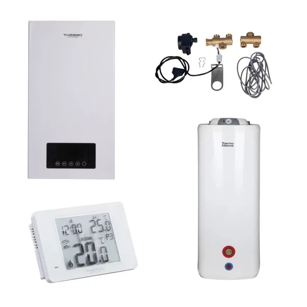 Комплексне рішення Thermo Alliance для котельні TA149DCN1247149 з електрокотлом на 12 кВт чудово підходить для середніх за розміром приміщень. В комплект входить аквакомплект для легкого монтажу, водонагрівач на 100 літрів і термостат з програмованим Wi-Fi функцією, що дозволяє користувачеві контролювати опалення віддалено. Ідеальний для будинків та квартир, де потрібна гнучкість в керуванні опаленням та гарячою водою.