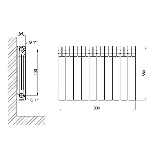Алюмінієвий радіатор Thermo Alliance серії All-Vulcan 500×96 мм (10 секцій) — легкий та ефективний секційний радіатор (арт. V50096A) з боковим підключенням, призначений для автономних і центральних систем опалення. Робочий тиск — до 16 бар, температура — до 110 °C. Вага однієї секції — 1,05 кг, теплова потужність — 188 Вт. Загальна потужність комплекту з 10 секцій — 1880 Вт. Міжосьова відстань — 500 мм. Матеріал — алюміній, товщина сталевої трубки — 2 мм.