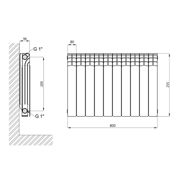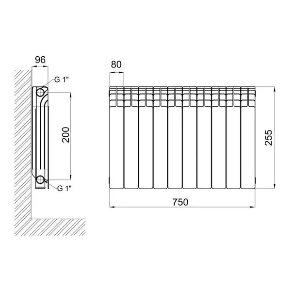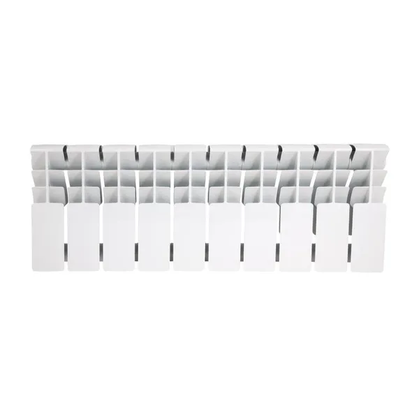 Радіатор біметалевий Thermo Alliance серії Bi-Ferrum 200×96 мм (10 секцій) — компактний і міцний секційний радіатор (арт. F20096B) з боковим підключенням, розрахований на тиск до 30 бар і температуру до 110 °C. Вага однієї секції — 0,81 кг, теплова потужність — 120 Вт. Загальна потужність — 1200 Вт. Міжосьова відстань — 200 мм. Товщина сталевої трубки — 2 мм. Радіатор підходить для автономних і централізованих систем опалення.