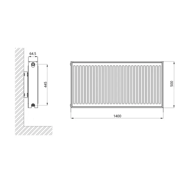 Радіатор сталевий Thermo Alliance 11 тип 500×1400 мм з боковим підключенням (арт. TA115001400K) — потужний панельний радіатор для настінного монтажу в автономних системах опалення. Забезпечує високу тепловіддачу 1363 Вт, витримує тиск до 10 бар і температуру до 95 °C. Виготовлений зі сталі товщиною 1,2 мм. У комплекті — кран Маєвського, заглушка та набір кронштейнів для настінного кріплення.