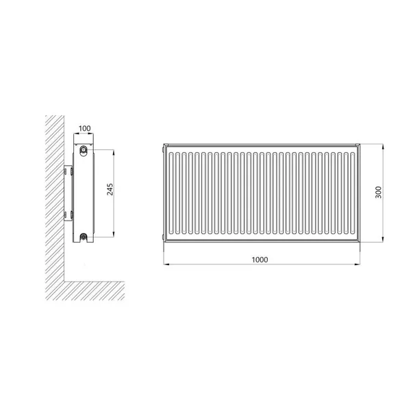 Радіатор сталевий Thermo Alliance 22 тип 300×1000 мм з боковим підключенням (арт. TA223001000K) — продуктивний панельний радіатор з двома панелями та двома конвекторами, призначений для настінного монтажу в автономних системах опалення. Забезпечує тепловіддачу 1202 Вт при температурі до 95 °C і тиску до 10 бар. Виготовлений зі сталі товщиною 1,2 мм. У комплекті — кран Маєвського, заглушка та набір кронштейнів для настінного кріплення.