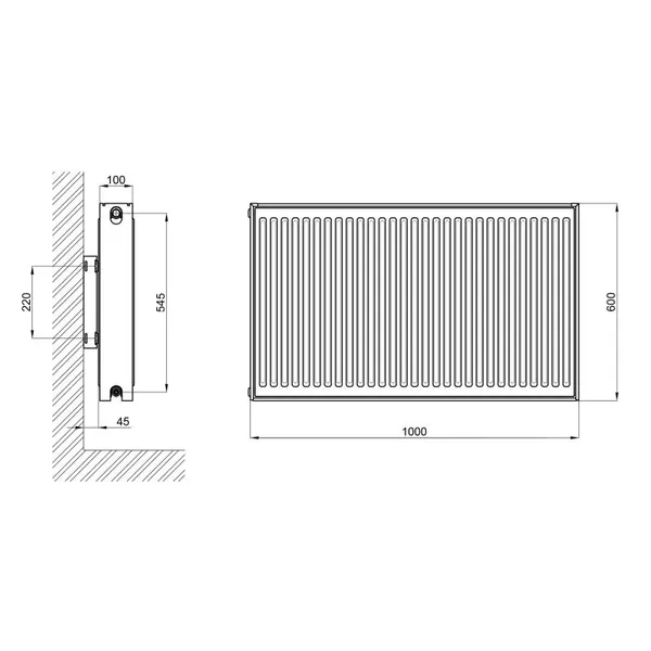 Радіатор сталевий Thermo Alliance 22 тип 600×1000 мм з боковим підключенням (арт. TA226001000K) — настінний панельний радіатор з двома панелями та двома конвекторами, призначений для автономних систем опалення. Тепловіддача — 2121 Вт, товщина сталі — 1,2 мм. Витримує температуру до 95 °C і тиск до 10 бар. У комплекті — кран Маєвського, заглушка та комплект кронштейнів для настінного кріплення.