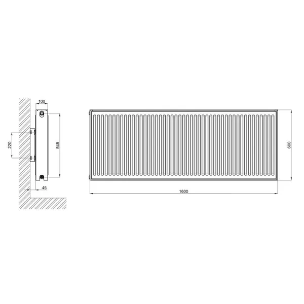 Радіатор сталевий Thermo Alliance 22 тип 600×1600 мм з боковим підключенням (арт. TA226001600K) — потужний панельний радіатор з двома панелями та двома конвекторами, призначений для настінного монтажу в автономних системах опалення. Тепловіддача — 3485 Вт. Робоча температура — до 95 °C, тиск — до 10 бар. Товщина сталі — 1,2 мм. У комплекті — кран Маєвського, заглушка та набір кронштейнів для настінного кріплення.