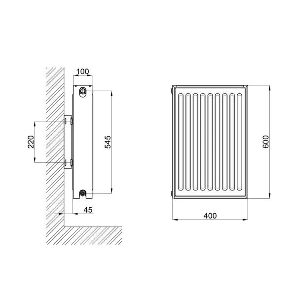 Радіатор сталевий Thermo Alliance 22 тип 600×400 мм з боковим підключенням (арт. TA22600400K) — компактний панельний радіатор з двома панелями та двома конвекторами, призначений для настінного монтажу в автономних системах опалення. Тепловіддача — 848 Вт. Радіатор витримує температуру до 95 °C і тиск до 10 бар. Виготовлений зі сталі завтовшки 1,2 мм. У комплекті — кран Маєвського, заглушка та комплект кронштейнів для настінного кріплення.