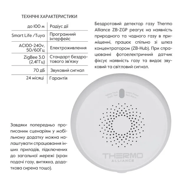 Бездротовий детектор газу Thermo Alliance ZB-ZGP реагує на наявність природного та чадного газу в приміщенні, працює спільно зі шлюз концентратором (ZB-Hub). При спрацюванні фотоелектричний датчик фіксує наявність газу та видає звуковий та світловий сигнал. Також відбувається надсилання повідомлення користувачеві через мобільний додаток на телефон або планшет із встановленим на них мобільним додатком. Завдяки попередньо прописаним сценаріям у мобільному додатку можна налаштувати спрацювання інших приладів, підключених до загальної мережі (кран подачі газу, витяжка, додаткова сирена тощо).