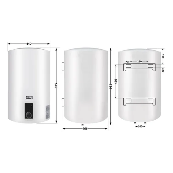 Водонагрівач Thermo Alliance 100 л D100V20J3(D)K — бойлер у круглому корпусі з двома нагрівальними елементами, які не мають прямого контакту з водою. Внутрішню поверхню бака захищають від корозії шар високоякісної емалі та магнієвий анод. Монтаж на стіну слід виконувати вертикально, патрубки для підключення водопровідних труб розташовані внизу. Монтажна схема та рекомендації щодо підключення пристрою до системи водопостачання наведені в інструкції. Товщина внутрішнього бака — 2 мм.