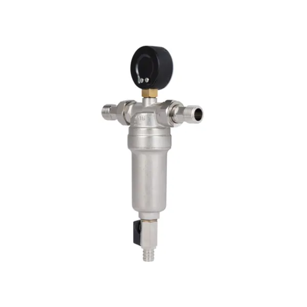 Самопромивний фільтр Thermo Alliance Standart 1/2" для води виготовлений із латуні з нікельованим покриттям, у комплекті є манометр.