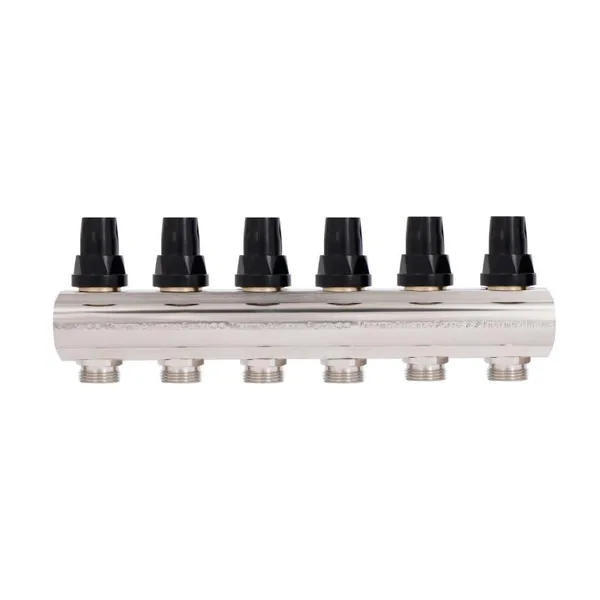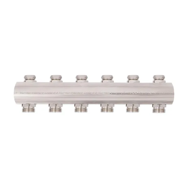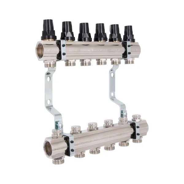 Колектор Thermo Alliance Forte 1" на 6 виходів знадобиться при облаштуванні систем опалення. Гребінка відповідає за розподіл теплоносія в опалювальних контурах. Виріб виконаний з латуні, складається з верхньої і нижньої колекторних балок, для кріплення до стіни або в спеціальній шафі укомплектований двома кронштейнами. Розмір підключення до системи — 1", підключення петель — 3/4 дюйма. Замість ручок регулювання на термоклапани можна встановити сервоприводи 30х1,5.