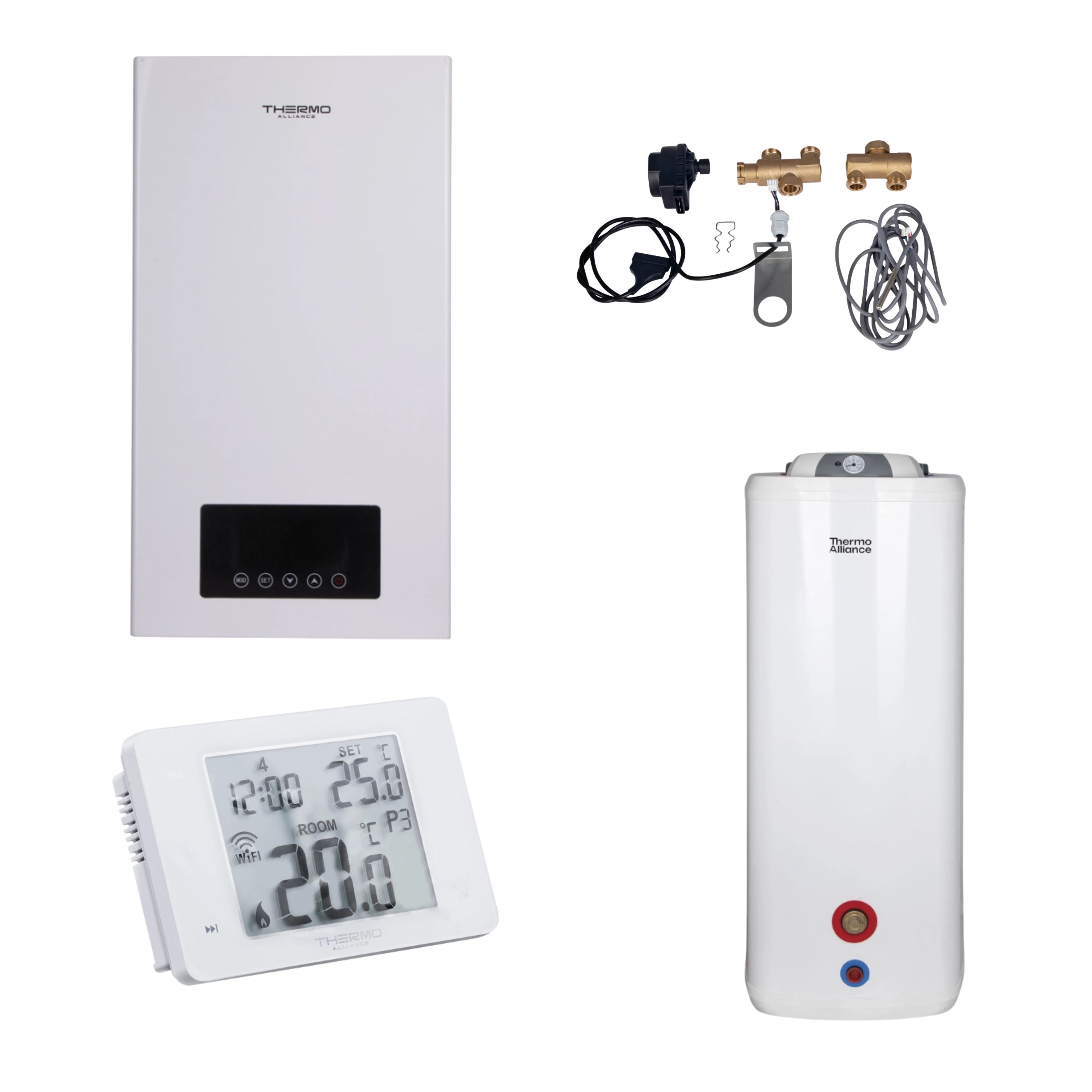 Комплексне рішення Thermo Alliance для котельні TA149DCN647208 є ефективним рішенням для опалення та гарячого водопостачання. Включає електрокотел потужністю 6 кВт, аквакомплект для підключення, комбінований водонагрівач об'ємом 100 літрів та програмований терморегулятор з Wi-Fi керуванням. Ідеальний для будинків та квартир, де потрібна гнучкість в керуванні опаленням та гарячою водою.