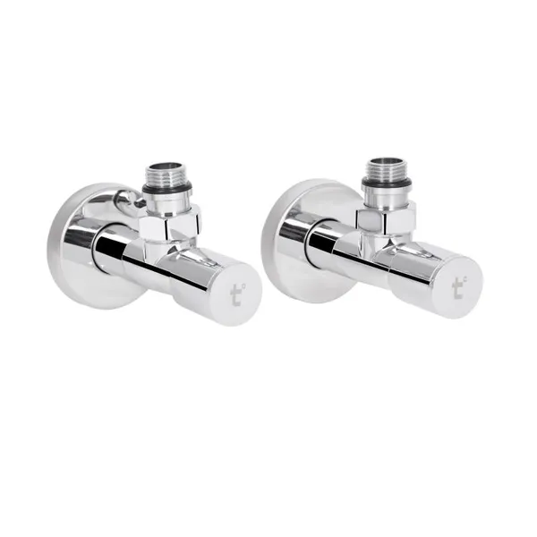 Комплект кранів Thermo Alliance Standart 1/2" НР кутовий SF395W15 призначений для використання при встановленні рушникосушки. Приладні крани виготовлені з високоякісної латуні, покриття — хромоване.