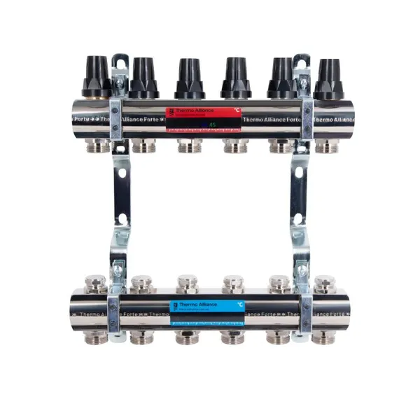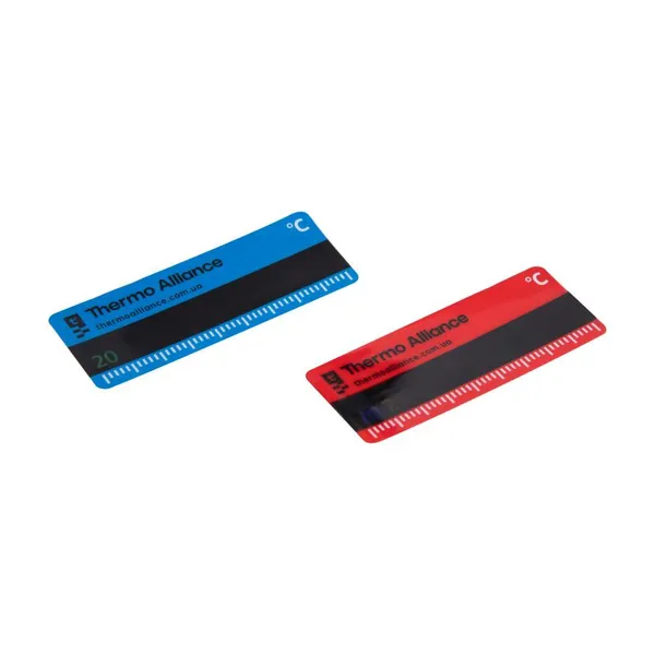 Комплект наліпок із термометром Thermo Alliance Standart призначений для візуального контролю температури на колекторі опалення. У наборі дві самоклеючі термополоси — червона та синя — із температурною шкалою від 20 °C до 60 °C. Наліпки дозволяють швидко визначити температуру подаючого та зворотного контурів, забезпечуючи зручний і наочний моніторинг системи. Завдяки якісному клейовому шару та стійким матеріалам вони надійно фіксуються на поверхні й зберігають точність показань під час експлуатації.