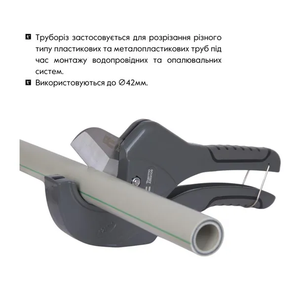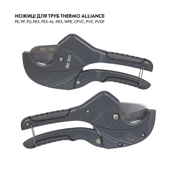 Ножиці для пластикових труб Thermo Alliance модель PRO-002 призначені для професійного використання та відповідають найвищим стандартам якості. Призначені для різання полімерних труб діаметром до 40 мм. Леза виготовлені із високоякісної нержавіючої сталі. Храповий механізм дозволяє робити точний і рівний зріз труб однією рукою з мінімальними зусиллями. Зручна ручка з антиковзким покриттям. Легкий та міцний корпус виготовлений з алюмінієвого сплаву. У комплекті передбачено запасне лезо.