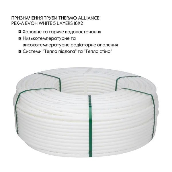 Труба PEX-A EVOH WHITE діаметром 16x2 від Thermo Alliance, вироблена в Іспанії, є високоякісною трубопровідною системою з антикисневим бар'єром EVOH, яка запобігає корозії і збільшує термін служби системи опалення. Виготовлена за технологією PEX-A, труба має високу гнучкість, міцність і стійкість до високих температур, що робить її ідеальною для монтажу в системах теплої підлоги. Довжина 320 метрів забезпечує зручність та економічність при встановленні на великих площах.